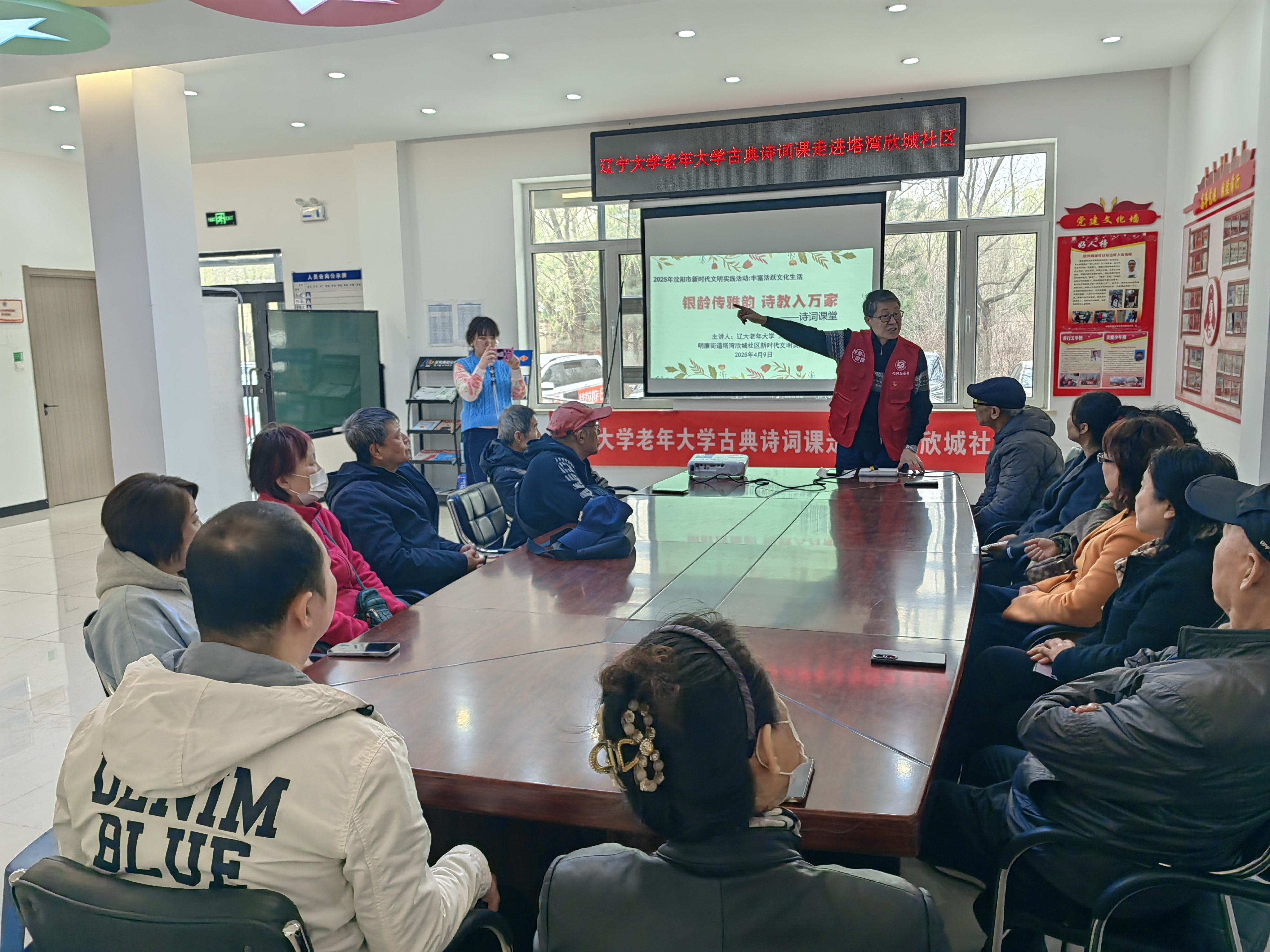 4月9日,老年大学公益课堂走进皇姑区塔湾欣城社区,刘子石老师为社区居民带来中华古典诗词课程。